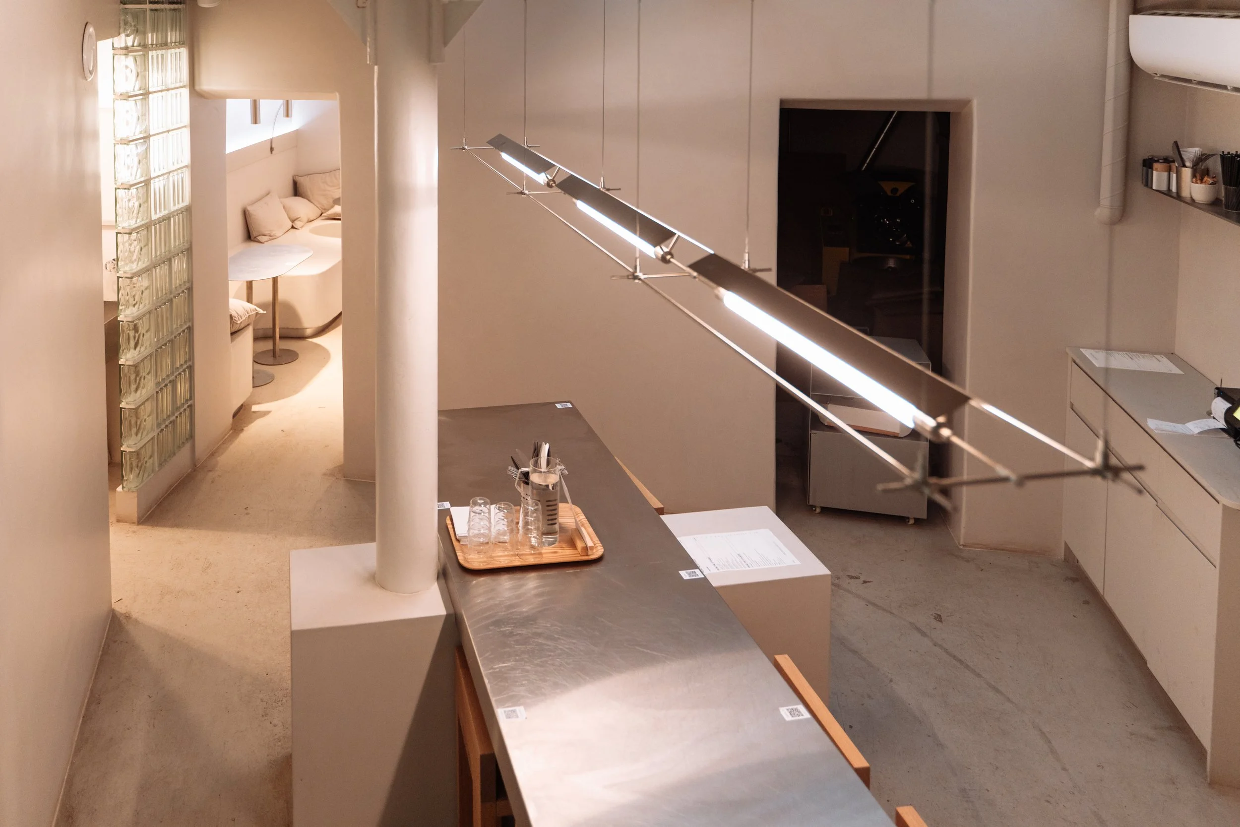 Downstairs you will find two spaces. The first is the community which is a bright and modern space, with clean lines and a central table which can comfortably fit 12 people around it. This space is perfect for intimate meals, workshops and gatherings.
